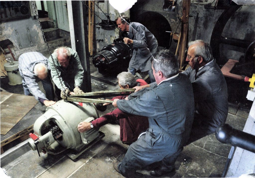 Le Moulin David est à l’abandon. Les machines rouillent. La municipalité, propriétaire du bâtiment, s’apprête à tout jeter à la casse. Un élu divonnais, Georges Leskens, ingénieur retraité du CERN, alerte le maire sur la valeur exceptionnelle de ce patrimoine et le convainc de le conserver. Il rassemble une équipe d’ingénieurs, techniciens, artisans, tous passionnés de mécanique et d’électricité, tous bénévoles, pour la plupart des anciens du CERN qui s’attellent à la restauration des machines.